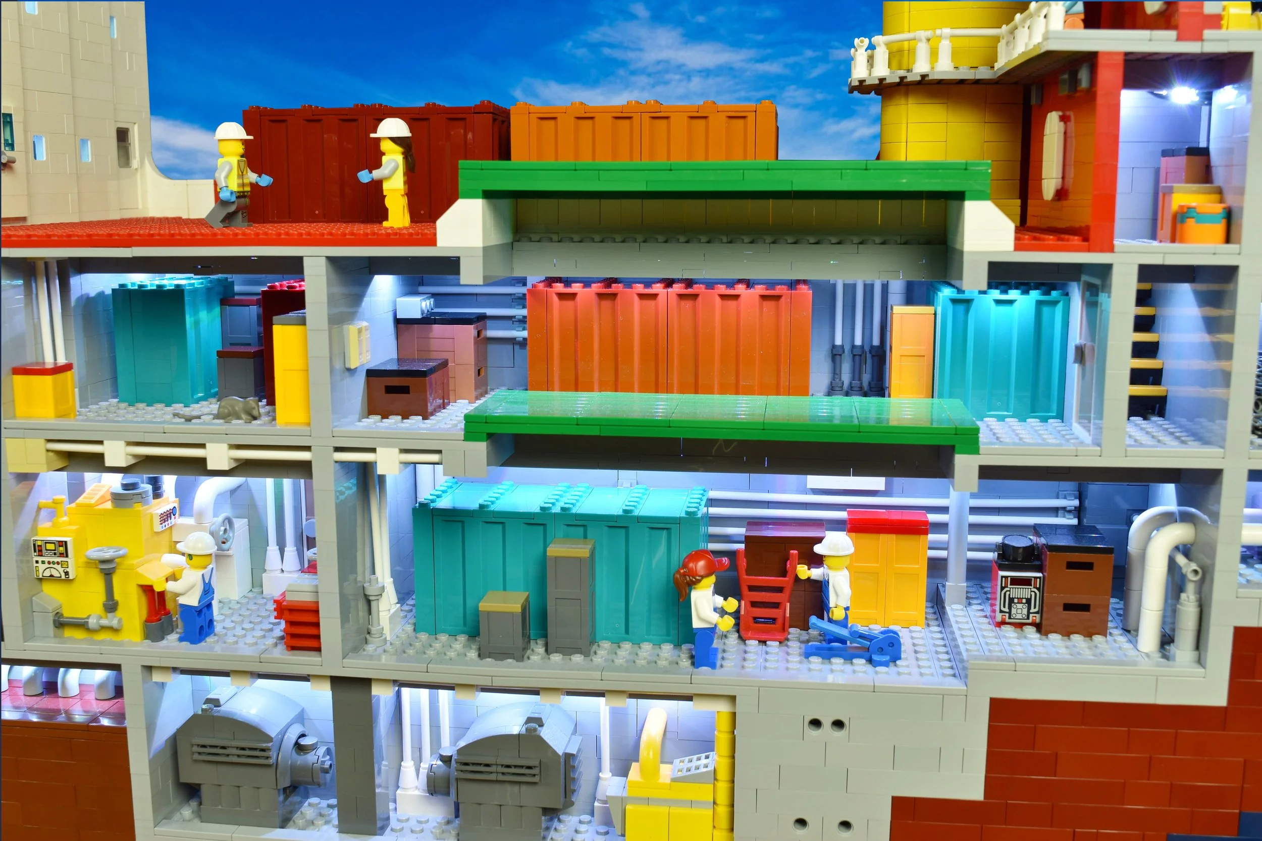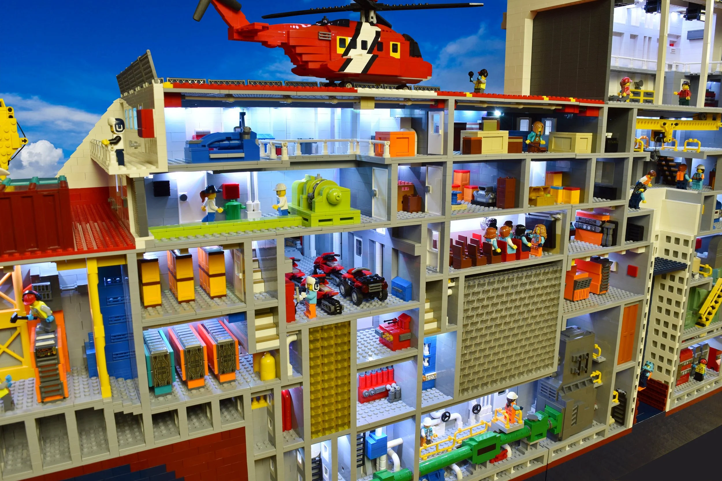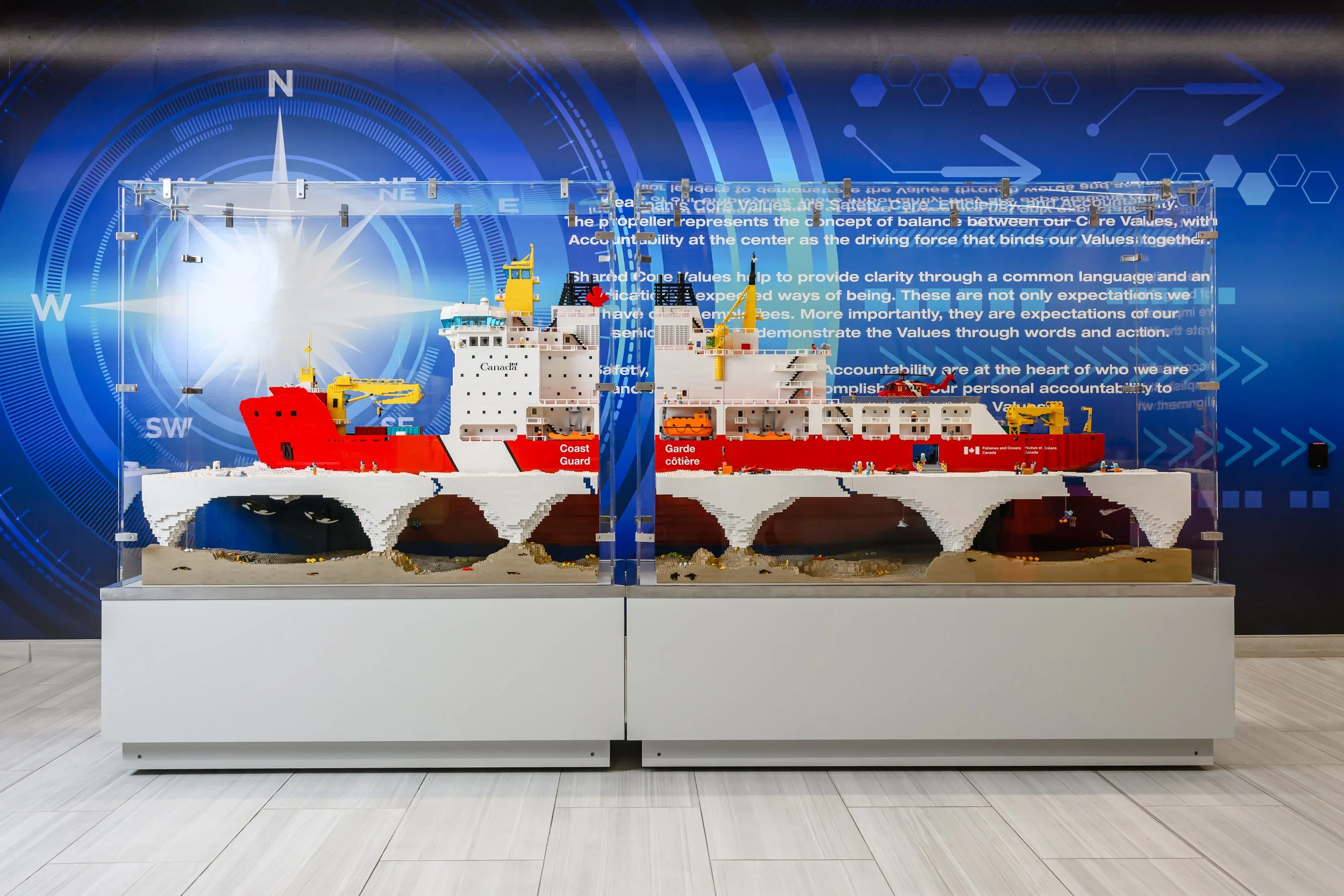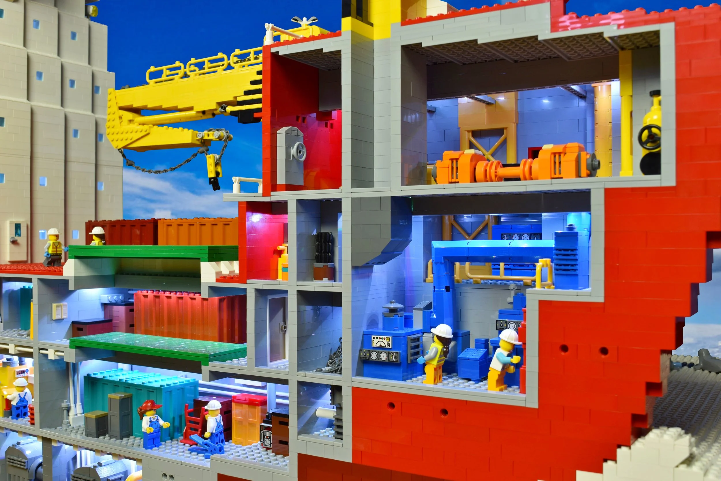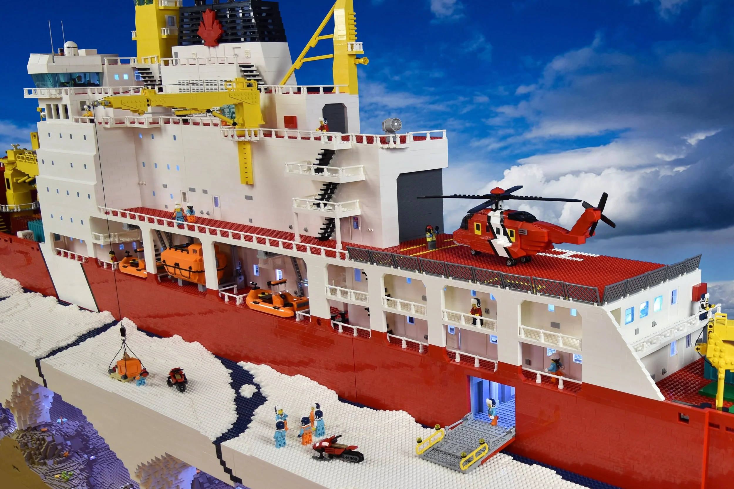 The Seaspan Polar Icebreaker LEGO project was a fun and challenging Mega Project. The ship model measures 11 feet long and 4 feet tall. For this project I partnered with LEGO Certified Professional Robin Sather. We started the design phase by deciding to make each internal floor of the vessel 7 LEGO bricks high. This would accommodate the height of a LEGO Minifigure and helped us determine how long the model needed to be. Next my partner on this project Robin Sather, drafted up a digital design of of the outline of the ship and later he used a digital program to map out the shape of the hull in LEGO form. Once we had this information in place we made our best guess on how many LEGO bricks and elements we would need to order. Once the bricks arrived I spent the next 6 months designing and building the ship’s exterior and interior as well as creating the ice and underwater landscaping.
